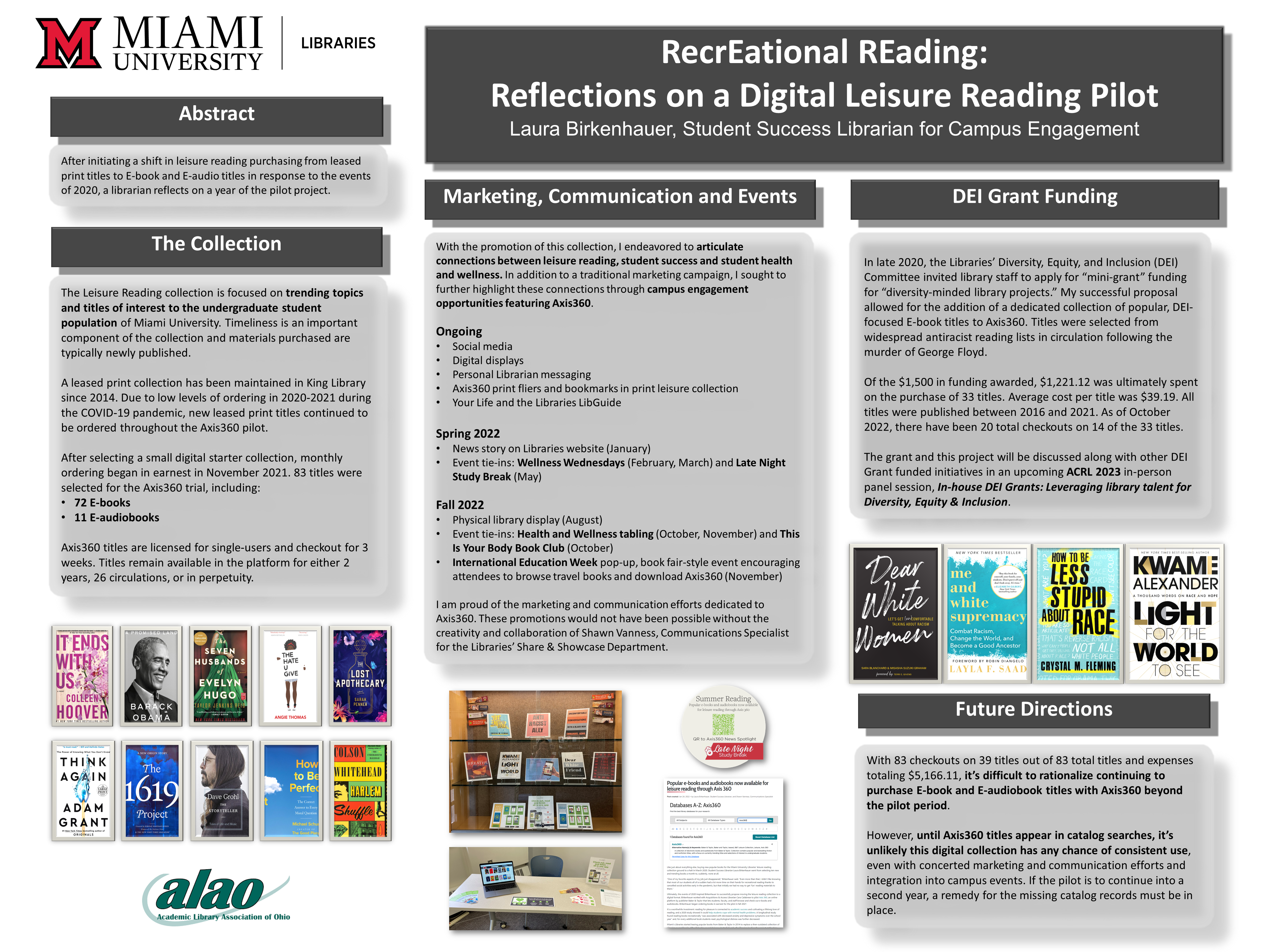 Poster additionally details titles purchased for and use of the grant funded, DEI-focused popular E-book collection, housed within the larger leisure reading collection.